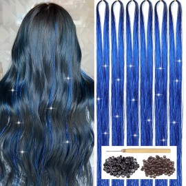 Blue Hair Tinsel Kit with Tool 6pcs 1200 Strands Glitter Tinsel Hair Extensions Heat Resistant Sparkling Shiny Fairy Hair Accessories for Women Girls Kids 47Inch