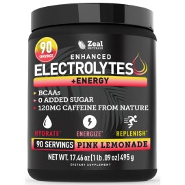 Zeal Electrolyte Powder - 90 Servings | Keto Electrolytes Powder | Zero Sugar, BCAAs, B-Vitamins | Potassium, Zinc, Magnesium | Hydration Powder Recovery Drink | Pink Lemonade
